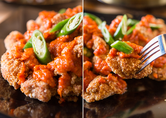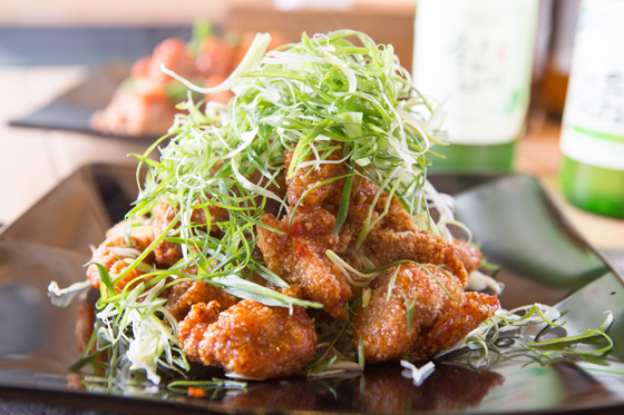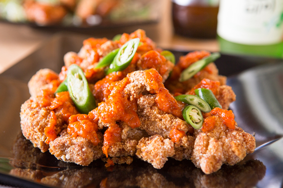 怕辣又想品嚐韓國炸雞美味之處的朋友,選這道就對了!點播率NO.1的人氣餐點,秘訣在將剛炸好的炸雞裹上獨家自製酸甜醬,再以新鮮綠蔥切成細絲狀包覆著,蔥味濃郁略帶原始馨香味,酸甜醬汁與酥脆外衣合為一體,即使是外皮就美味無比。