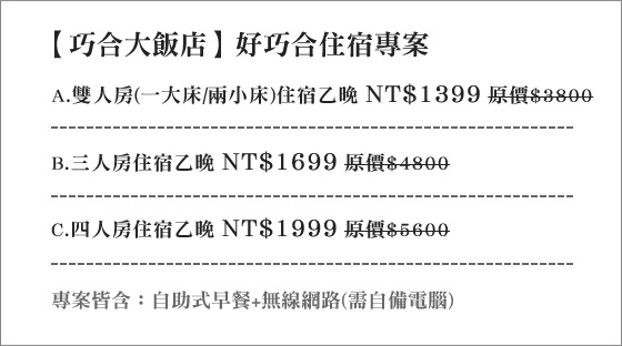 商品訊息簡述: 只要1399元起即可享【巧合大飯店】原價最高5600元好巧合住宿專案:(A)雙人房(一大床/兩小床)住宿乙晚/(B)三人房住宿乙晚/(C)奶H房住宿乙晚,專案皆含:自助式早餐+無線網路(需自備電腦)!