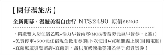 商品訊息簡述: 只要2480元(雙人價)即可享【園仔湯旅店】原價6200元全新開幕,漫遊美湯自由行:精緻雙人房住宿乙晚+活力早餐兩客+免費停車+500元住宿現金抵用券(限下次使用)+寬頻無線上網(自備電腦)+宜蘭旅遊導覽諮詢+宜蘭餅、諾貝爾奶凍捲等知名伴手禮貴賓券!