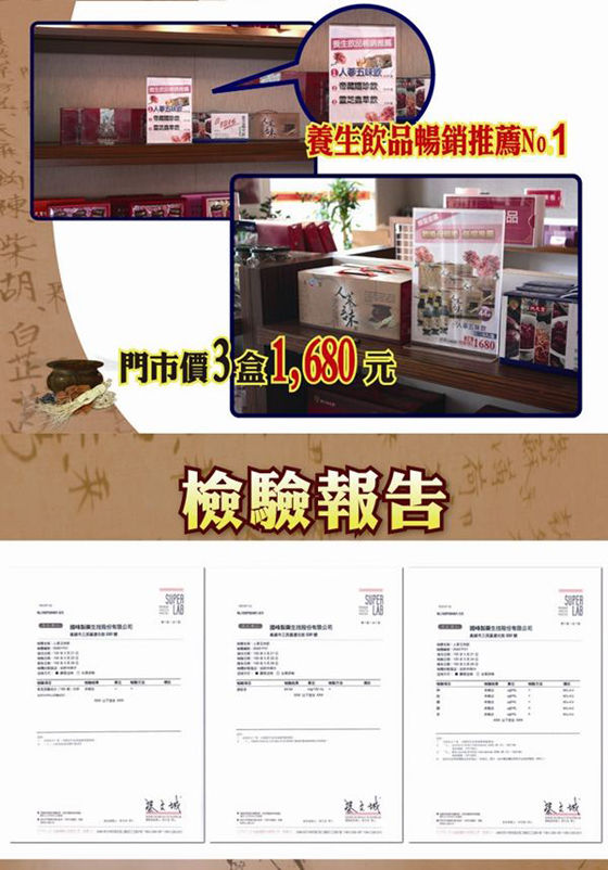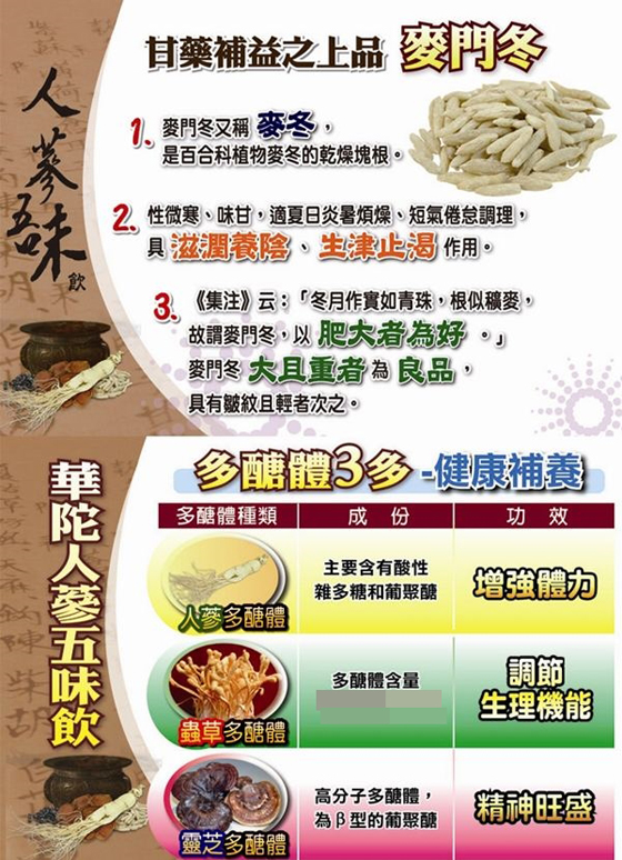商品成分:長白山人蔘、人蔘萃取物、加拿大花旗蔘、黨蔘萃取物、麥冬、五位子、靈芝子實體、北蟲草子實體、枸杞、紅棗、紅景天、檸檬酸、檸檬酸納、果糖。