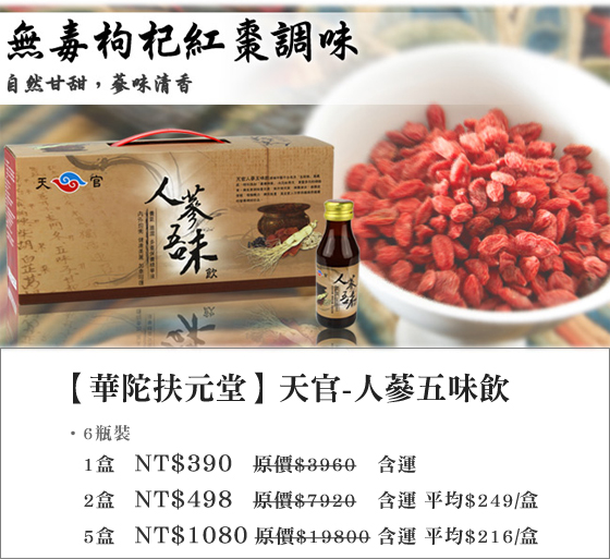 商品訊息簡述: 平均每盒最低只要216元起(含運)即可享有【華陀扶元堂】天官-人蔘五味飲(6瓶裝)1盒/2盒/5盒。